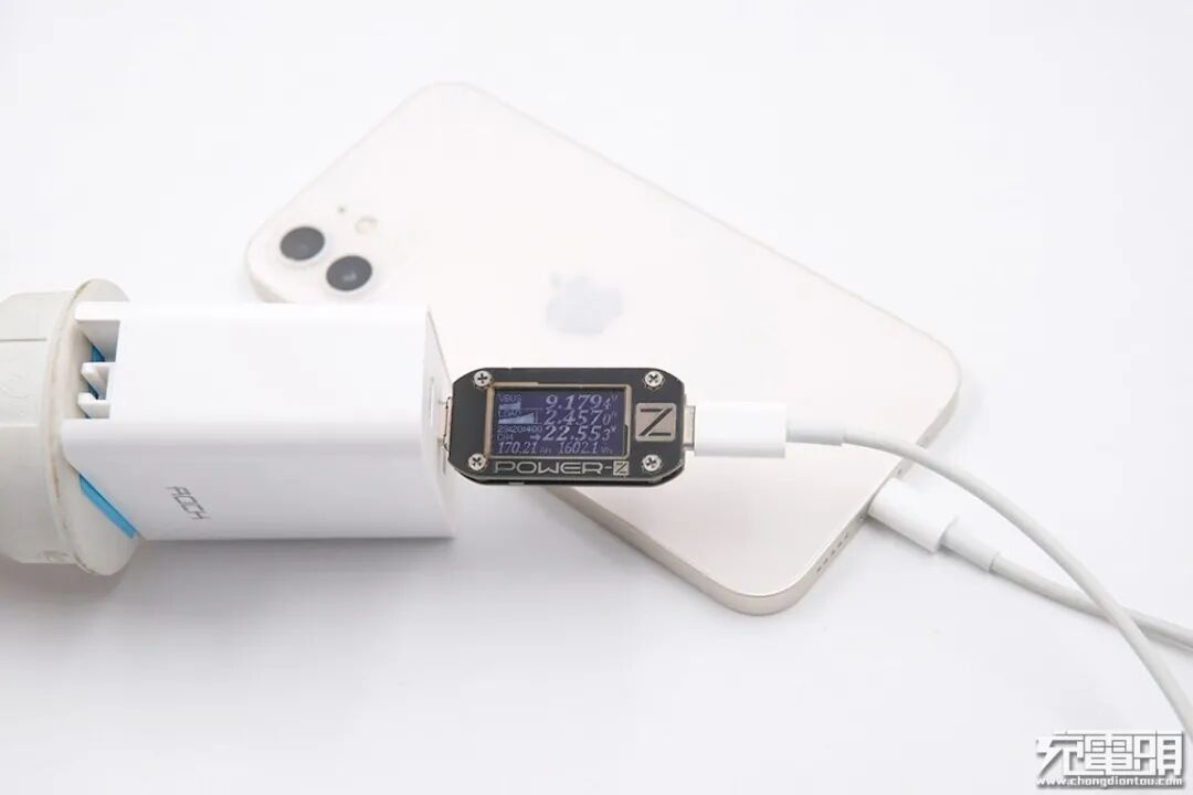 使用ROCK65W PD RH-PD65W充电器为iPhone 12充电,电压9.17V,电流2.45A,功率22.55W。