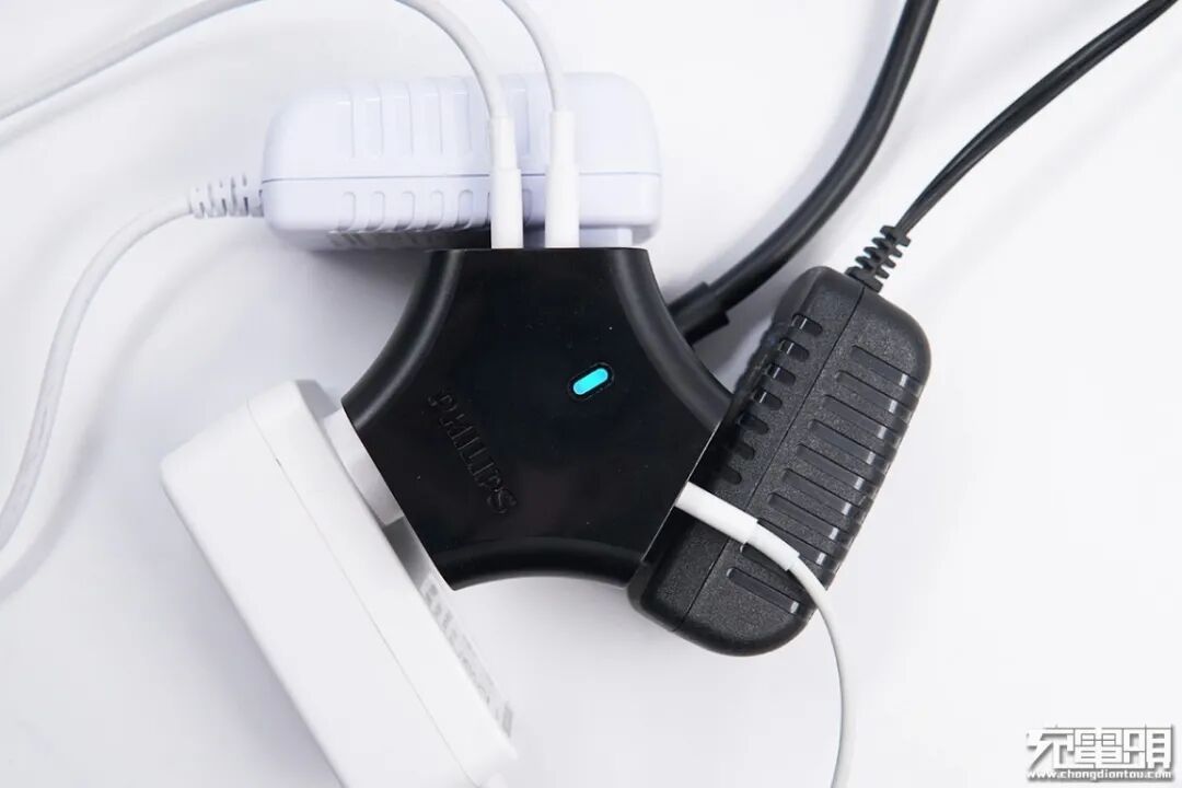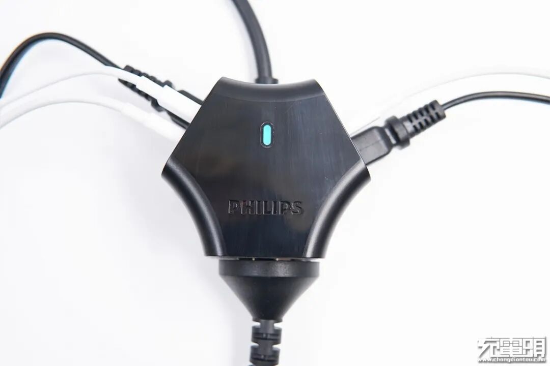 飞利浦延长线插座Y形三角设计让插孔分开三个面,没有传统插线板那种孔距的概念,插上三个插头完全不会干扰。
