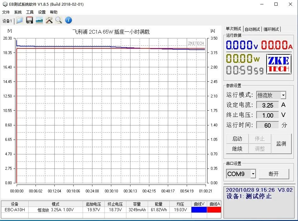 使用EB程控电子负载测试飞利浦 2C1A 65W插座USB-C接口的最大输出功率,以0.1A为电流步进幅度,10秒为时间间隔,最终录得最大输出为19.16V 3.30A 63.2W。