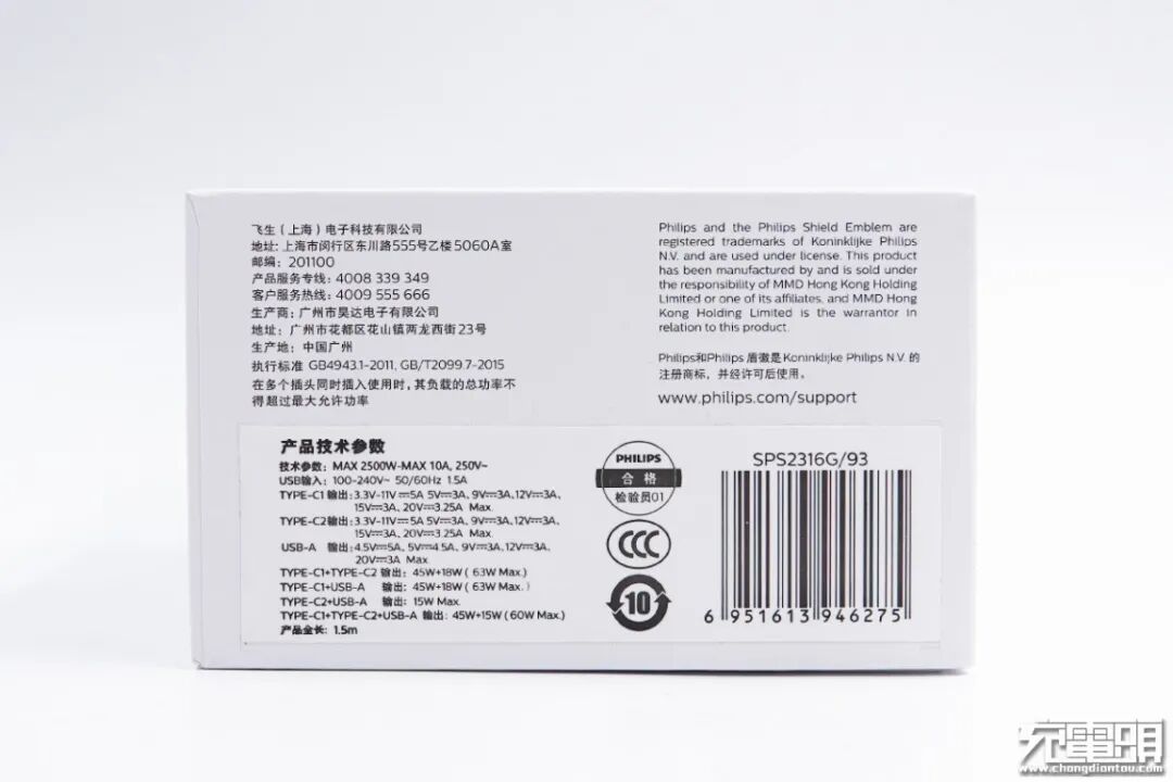 飞利浦延长线插座底部是凹印的铭牌参数,产品型号为SPS2316G/93,其他不再赘述。