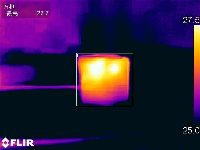 对飞利浦 2C1A 65W插座的温升进行测试,测试条件为在温度约为25℃的恒温箱内以20V 3.25A 65W的功率持续输出一小时进行测试。准备开始测试前,最高温度为27.7℃。
