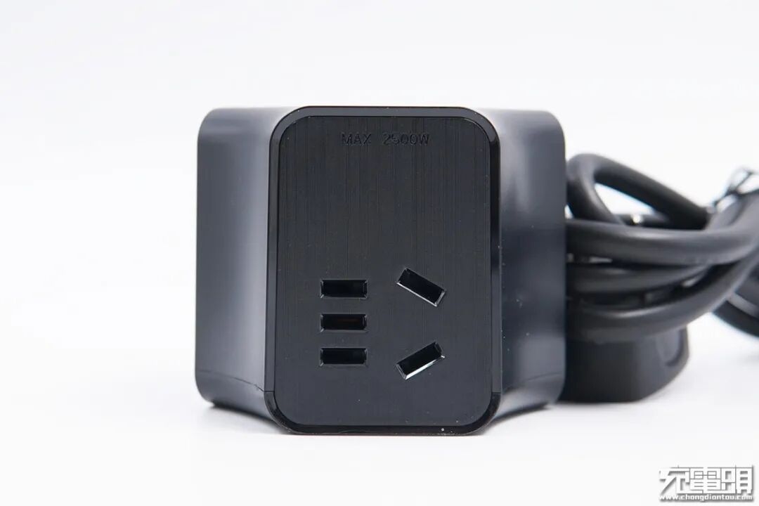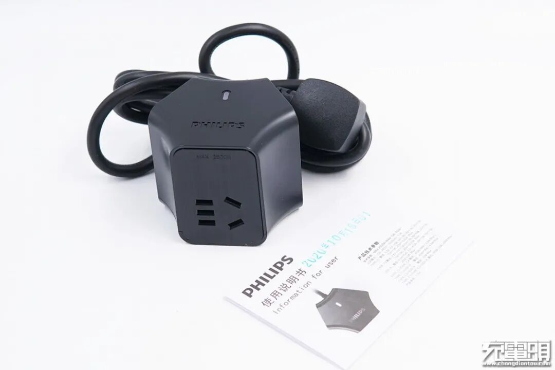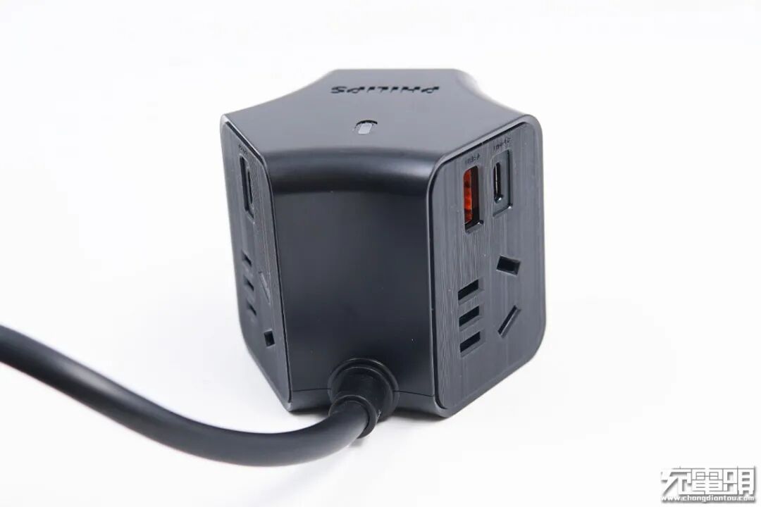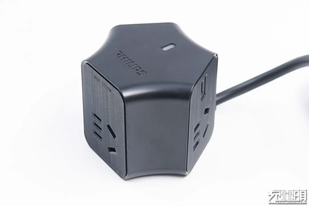 飞利浦 2C1A 65W插座采用Y形三角立体设计,神似摩天轮,既大幅度浓缩了插座体积,也提高了各插孔利用率。插座整体以黑色为主,点缀指示灯,总体外观不俗。
