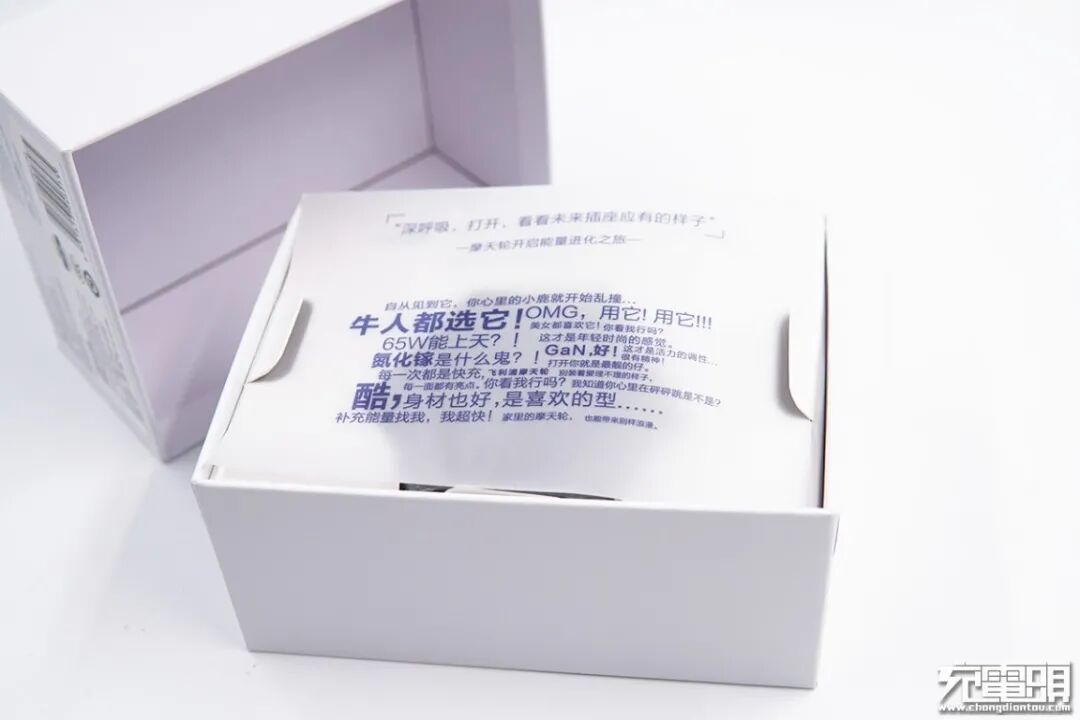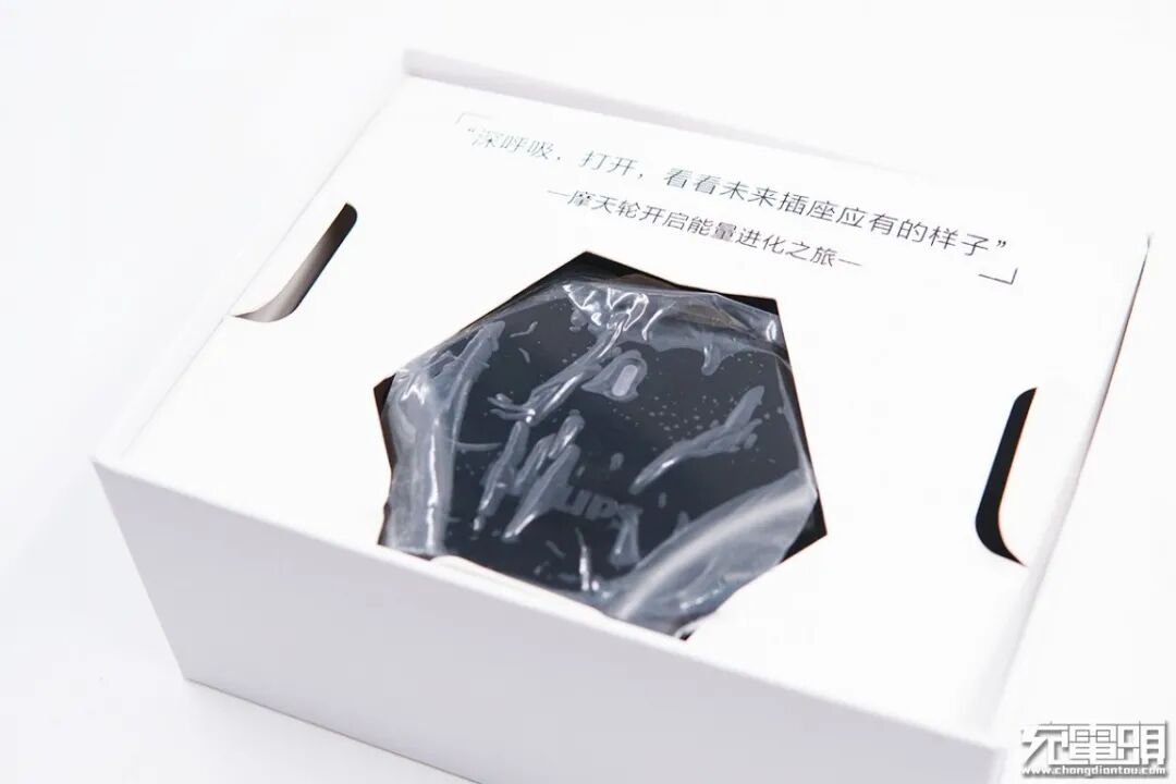 拿起后可以看到插座被“镶嵌”在纸壳中,上面印有“深呼吸,打开,看看未来插座应有的样子”字眼。