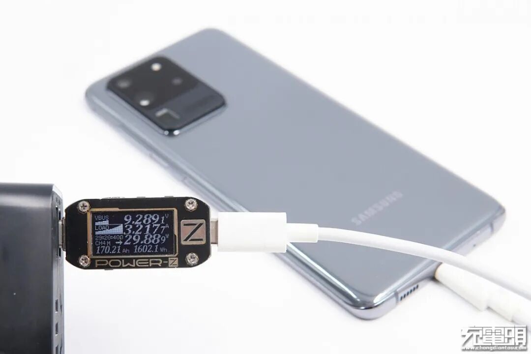 三星 S20 Ultra 5G手机支持PPS、AFC和USB PD快速充电协议,功率为9.28V 3.21A 29.88W。