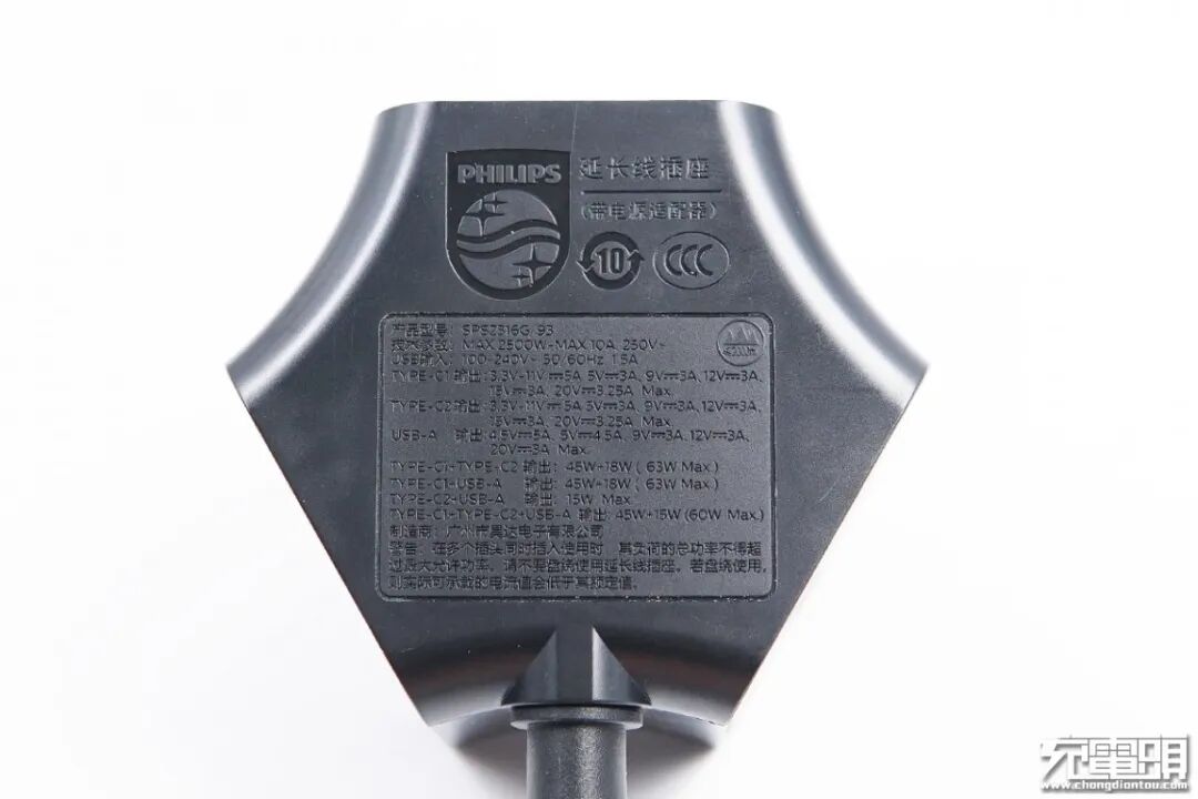 飞利浦延长线插座C面同样带有3+2国标插孔,右侧是USB-C输出模块,支持65W PD快充输出。