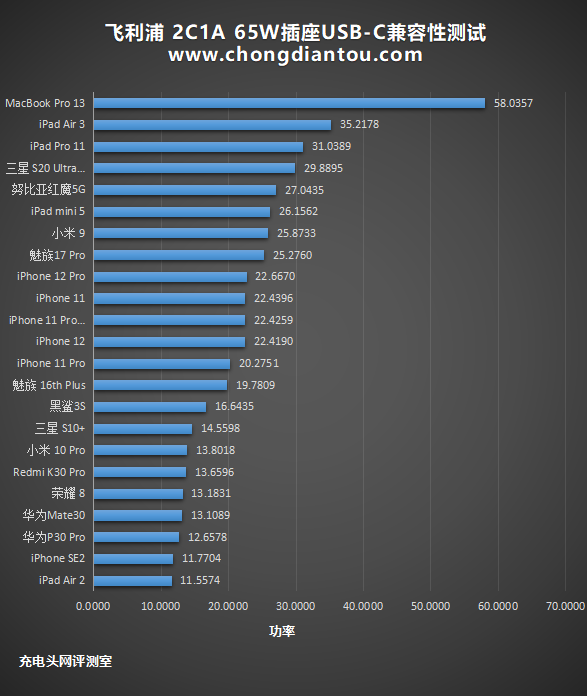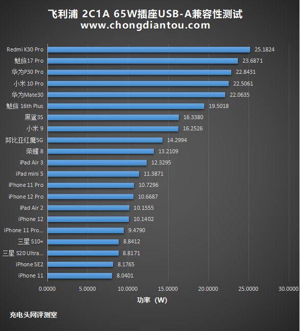 将数据放在柱状图中,可以看到排名前五名功率都超过20W;后五位的功率都不超过10W,最低则是iPhone 11。