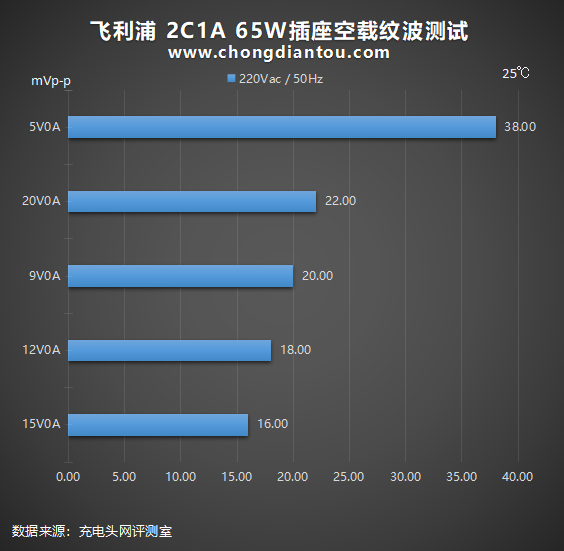 国家标准中充电器纹波要求是不高于200mV,飞利浦 2C1A 65W插座在110V 60Hz、240V 50Hz输入电压下,所有输出功率纹波峰峰值均低于200mV这个标准很多,表现不错。