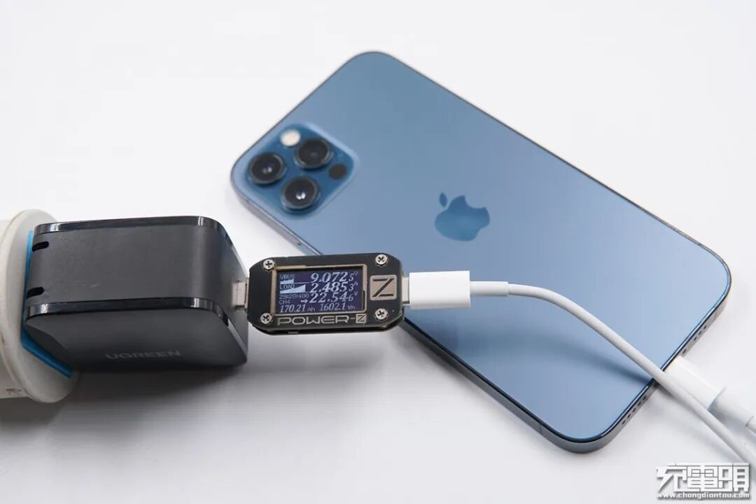 使用UGREEN绿联65W PD CD217充电器为iPhone 12 Pro充电,电压9.07V,电流2.48A,功率22.54W。