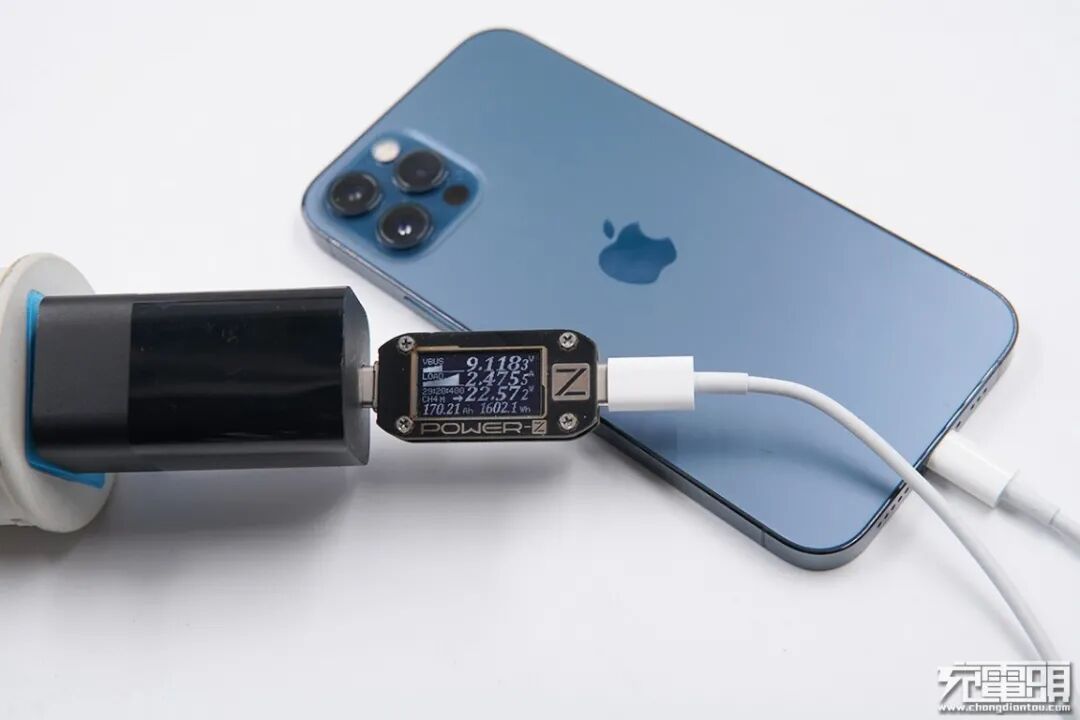 使用ZMI紫米65W PD HA932充电器为iPhone 12 Pro充电,电压8.98V,电流2.50A,功率22.53W。