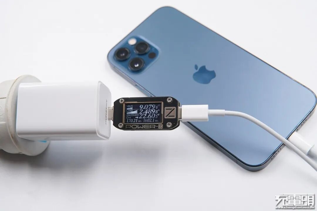 使用Amdapter飞频65W PD AMD100C充电器为iPhone 12 Pro充电,电压9.09V,电流2.48A,功率22.59W。