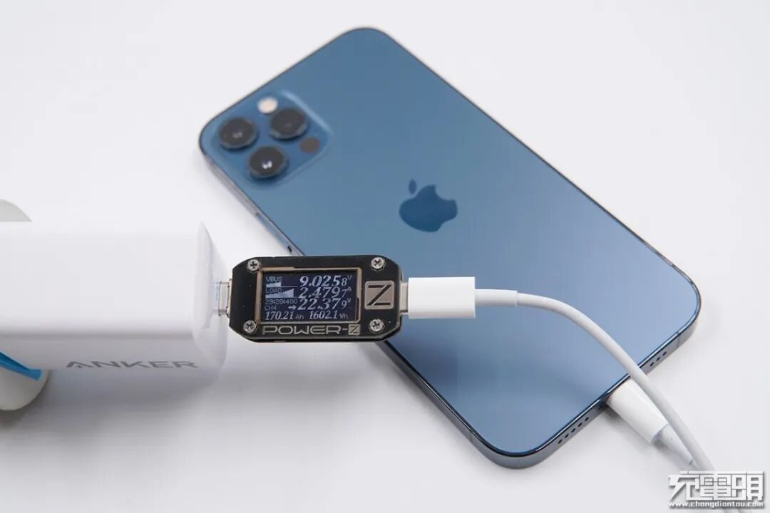 使用Anker安克65W PD A2718充电器为iPhone 12 Pro充电,电压9.02V,电流2.47A,功率22.37W。