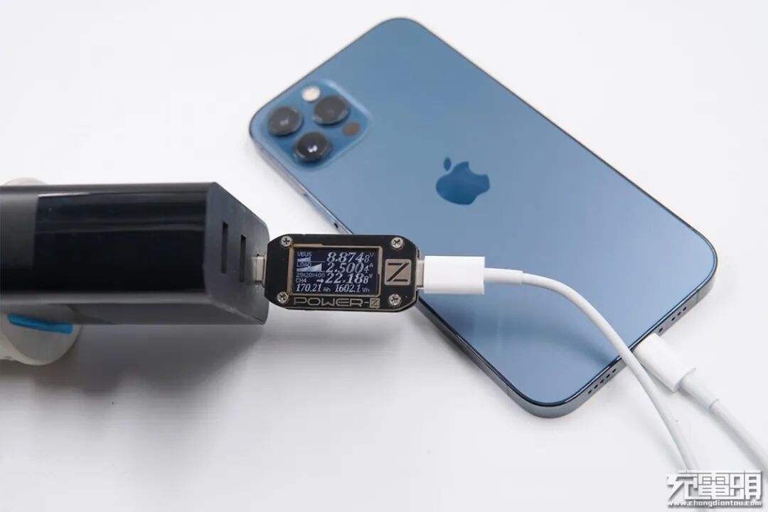 使用ZMI紫米65W PD HA835充电器为iPhone 12 Pro充电,电压8.87V,电流2.50A,功率22.18W。