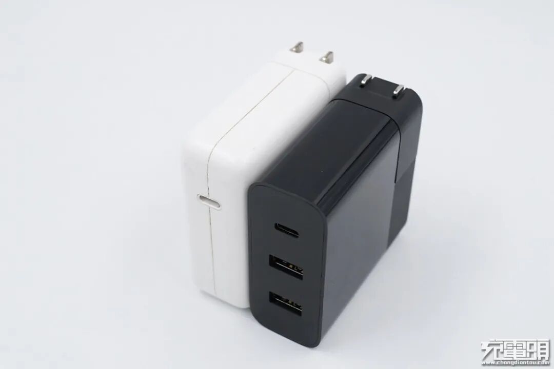 将紫米这款充电器与苹果61W充电器对比,可以发现整体相差不大,紫米的宽度稍窄,厚度稍多。