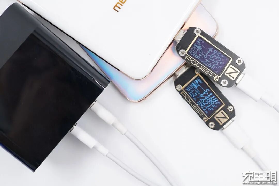 对充电器的多口同时输出进行测试,使用USB-A1为魅族 17 Pro充电,功率为4.95V 1.87A 9.27W,同时使用USB-A2为小米 10 Pro充电,功率为5.11V 1.48A 7.62W,充电器支持两个USB-A接口同时输出为设备充电。