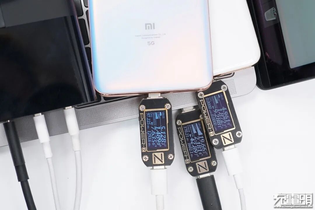 三口同时输出,使用USB-C为Macbook Pro 13充电,功率为19.66V 2.18A 42.89W,同时使用USB-A1为魅族 17 Pro充电,功率为4.96V 1.87A 9.28W,使用USB-A2为小米 10 Pro充电,功率为5.12V 1.48A 7.63W,充电器支持三口同时输出为设备充电,输出功率分配为45W+(5V⎓3.6A)充电模式。