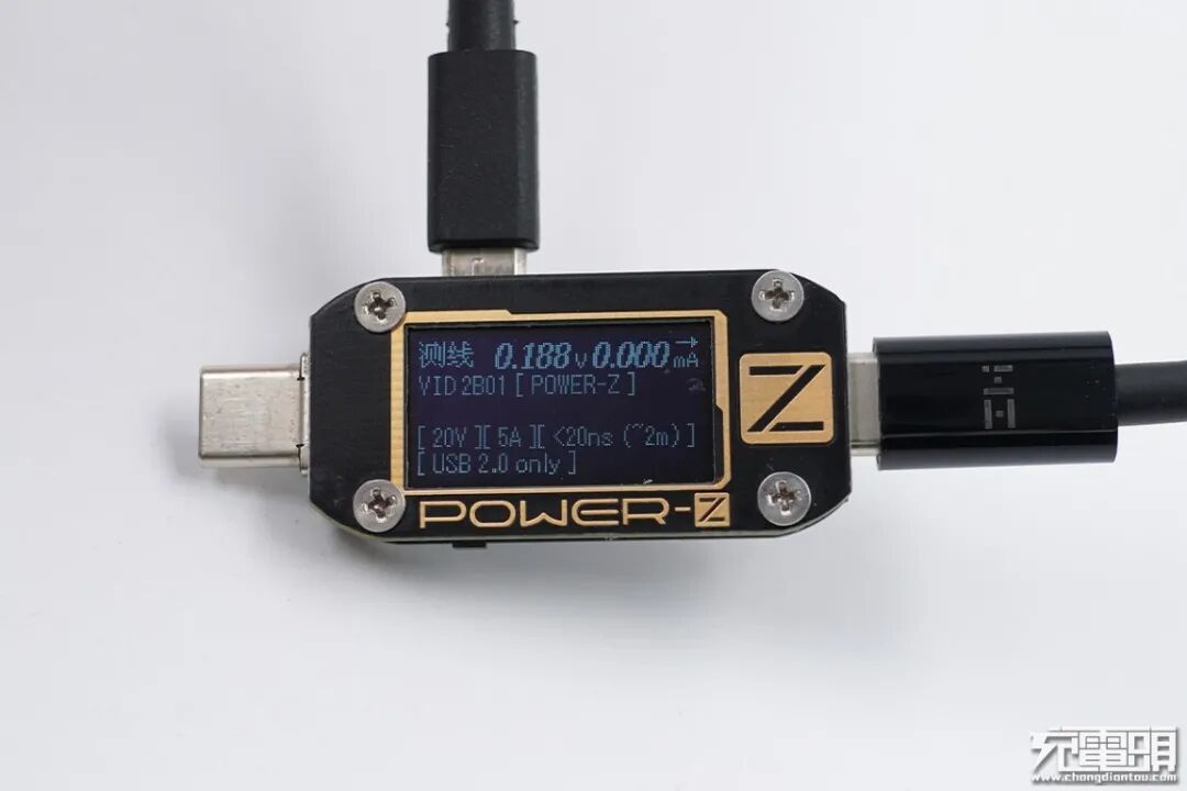 使用ChargerLAB POWER-Z KM001C检测发现,该线缆带有E-Marker芯片,电力传输能力为20V5A,数据传输能力为USB 2.0。