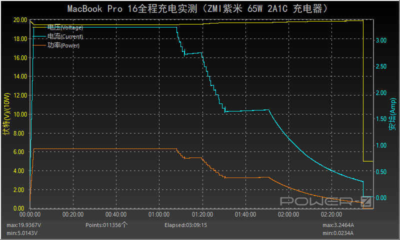模拟生活的使用场景,使用USB-C为MacBook Pro 16充电,来看一下充电全程的变化。经过短暂开机时间,功率到达了 20V 3.25A的功率档位;大功率输入持续了约1小时8分钟,随后后电流和功率开始阶梯式下降直至1小时52分;随后功率随着电流的逐渐下降而下降直至结束。最高功率为19.48V 3.24A 63.26W。