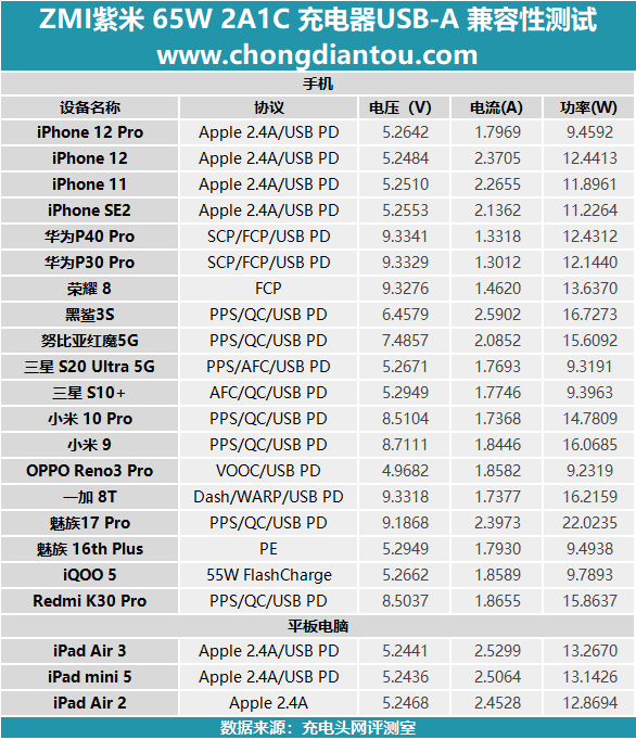 iPhone 12 Pro功率不到10W,iPhone 12功率超过12W,其他iPhone功率也超过11W;两款华为机型功率也在12W左右;小米9超过16W, 小米 10 Pro接近15W,Redmi K30 Pro则超过15W;魅族 17 Pro甚至超过22W。