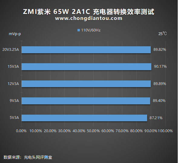 充电器本质上是一种转换设备,过程中会有损耗,以热量的形式散发出来。转换效率指的是充电器输出功率和输入功率的比值,也就是对电能的利用效率,转换效率越高越省电。ZMI紫米 65W 2A1C 充电器在110V 60Hz和220V 50Hz交流输入的各个电压档位下共测试出十个数据,从86.37%到90.97%不等。