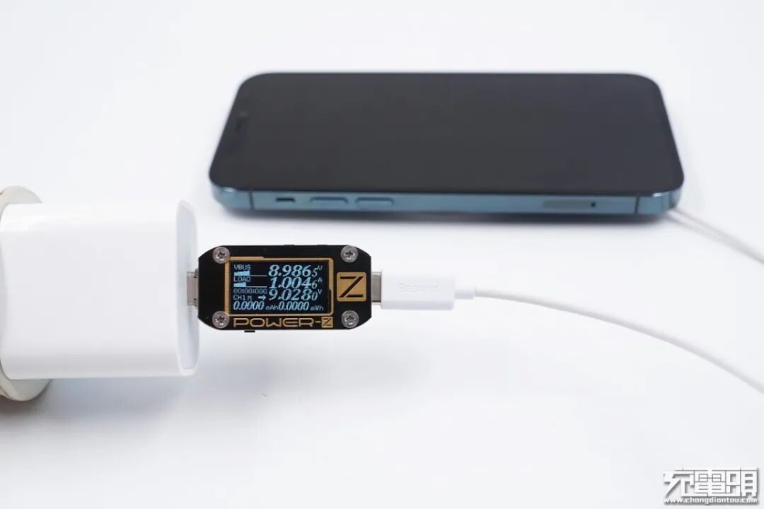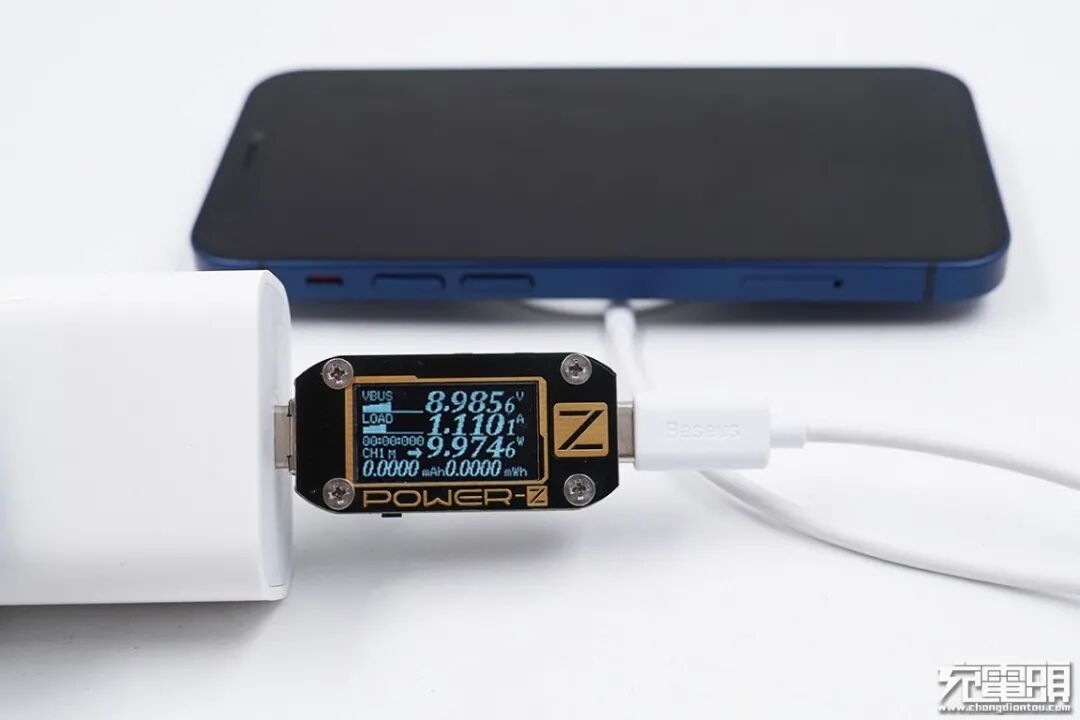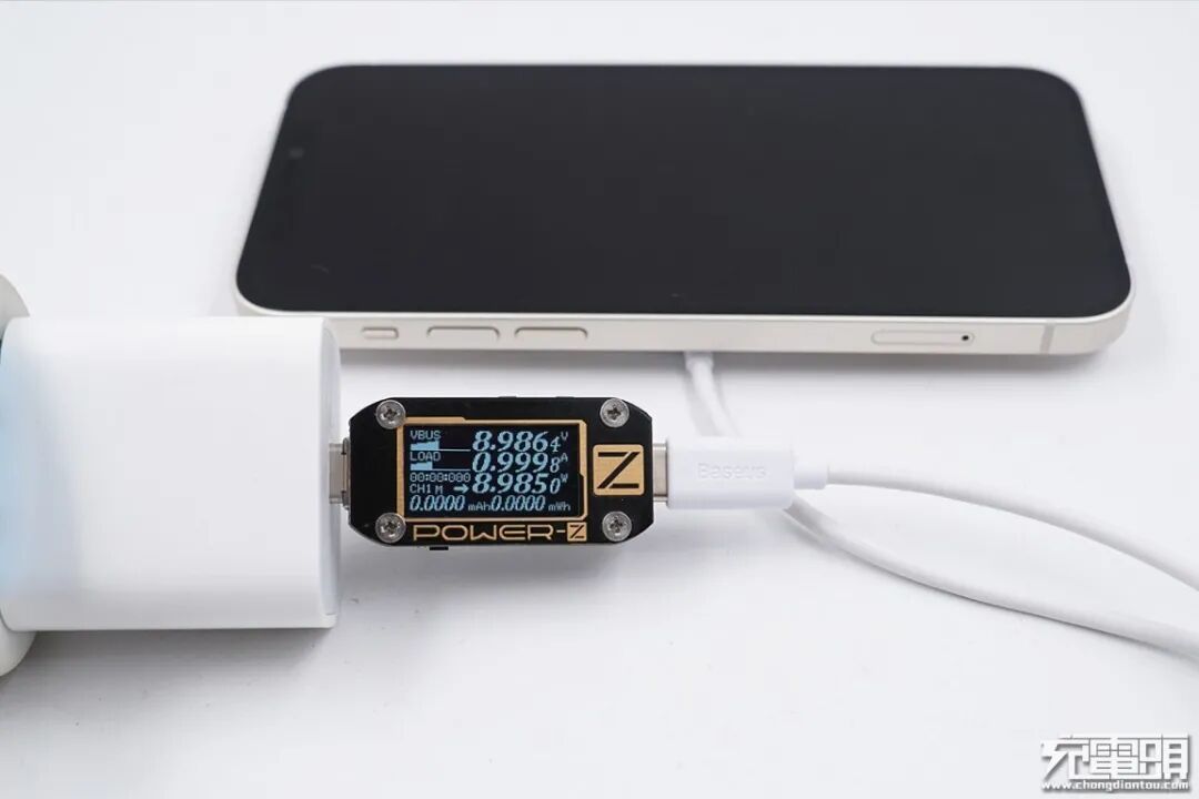 下面对iPhone 12系列以及小米9进行测试,每次测试前都将倍思极简Mini磁吸无线充电器进行降温处理,手机的电量也保持在20%以下的低水平;测试的仪器为POWER-Z KM001,位置统一在靠近无线充的USB-C端口;充电器采用苹果20W PD充电器,线材使用倍思的快充短线。