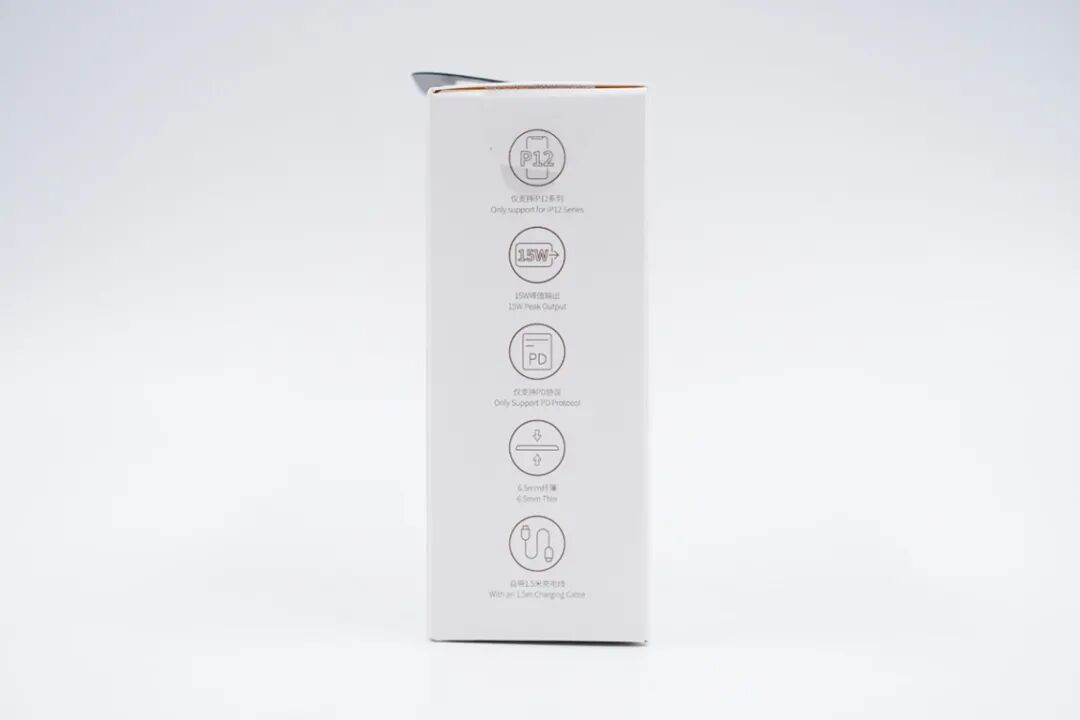 侧面印有五个卖点:仅支持iPhone 12系列、15W峰值输出、仅支持PD协议、纤薄简约的外观、自带1.5m充电线。这里可以看出这款充电器是专为iPhone 12系列打造,不建议其他机型用户购买。