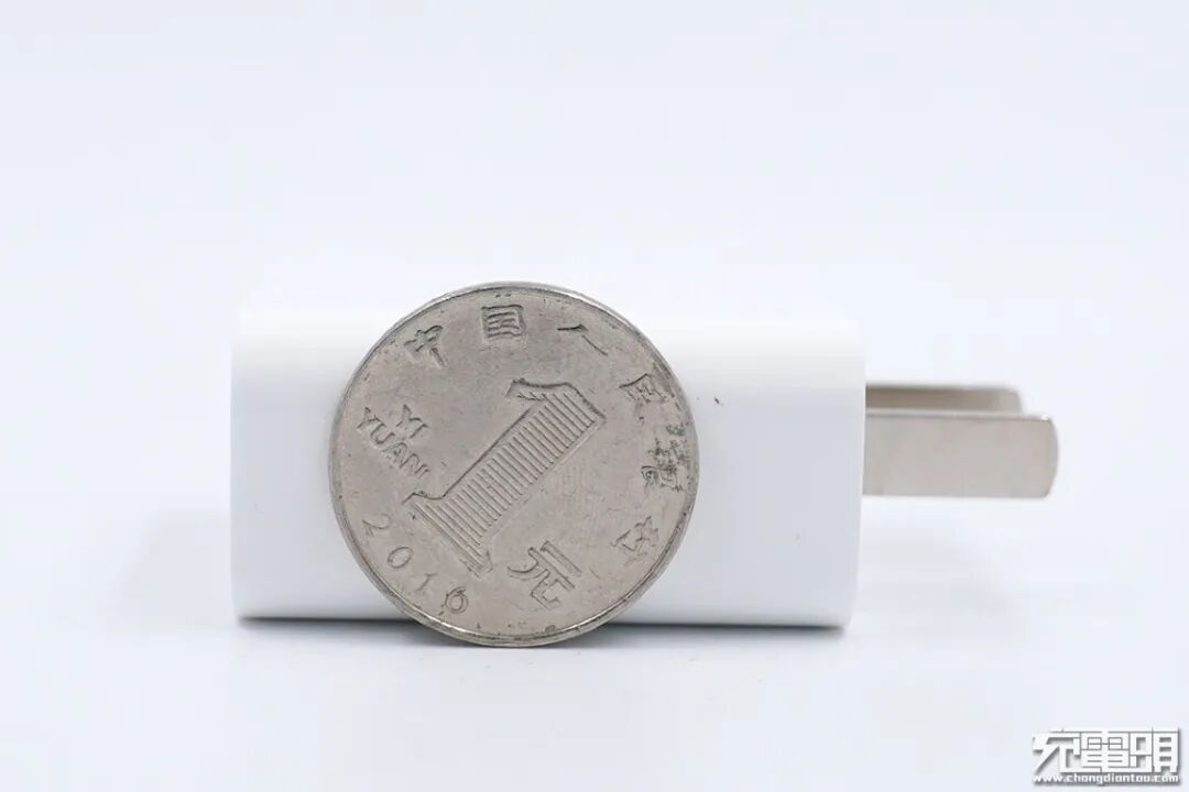将一元硬币靠在侧面,可以看到充电器厚度比硬币直径低上不少。