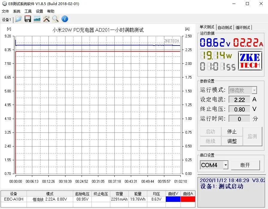 使用EB程控电子负载测试小米20W PD充电器的最大输出功率,以0.1A为电流步进幅度,10秒为时间间隔,最终录得最大输出为8.59V 2.40A 20.6W。