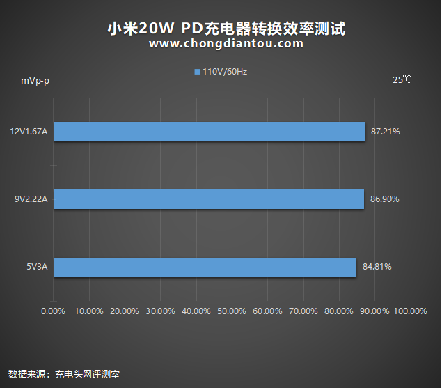 国家标准中充电器纹波要求是不高于200mV,小米20W PD充电器在110V 60Hz、240V 50Hz输入电压下,所有输出功率纹波峰峰值均低于200mV这个标准。
