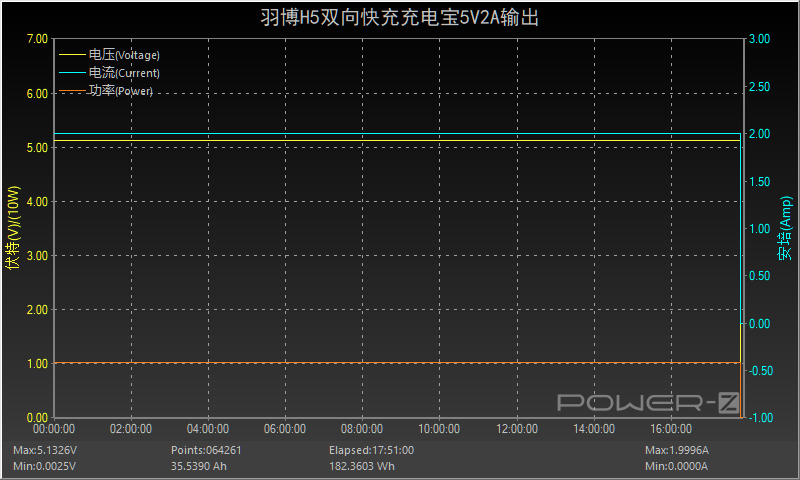 下面来看看羽博H5的输出效率表现,首先以5V2A的功率对其进行输出效率测试,测试全程三个数据平台均持稳定的输出状态,全程耗时约17小时47分。放出的能量约为182.3603Wh,所以羽博H5双向快充充电宝在以5V2A档位输出时效率约为182.3603/185=98.57%。