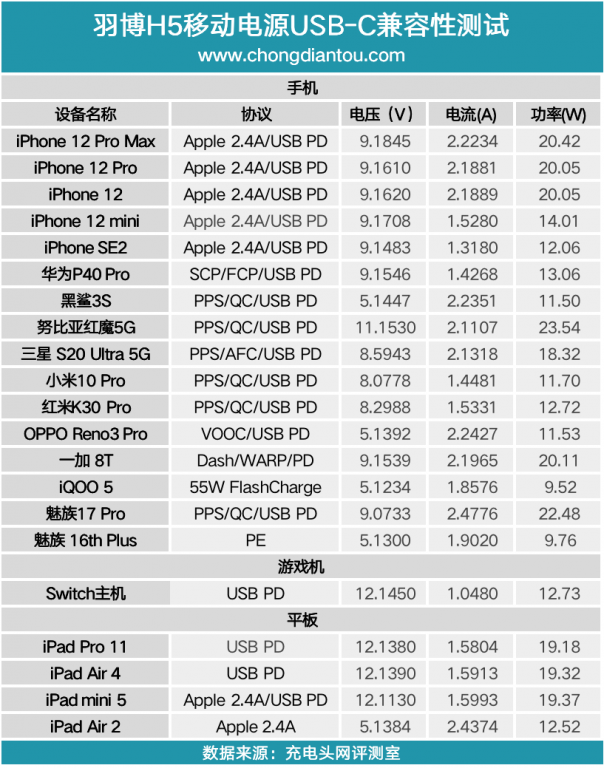 1、USB-C将USB-C输出兼容性的测试数据汇总成表,大部分的设备都可以握手相应的快充,只有黑鲨3S握手了5V3A快充。