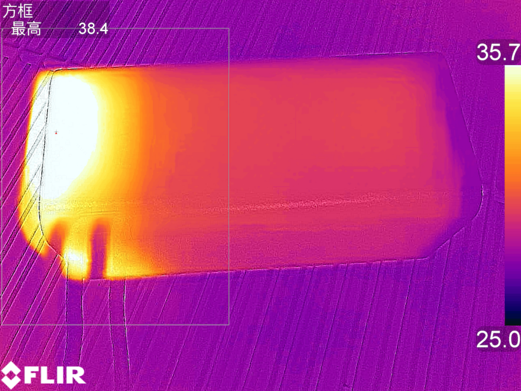 翻转至另一面, 最高温度为38.4℃,温升10.1℃。在使用20W的输出功率持续一小时后整体温升在10℃左右,实际摸上去并没有温热的感觉。