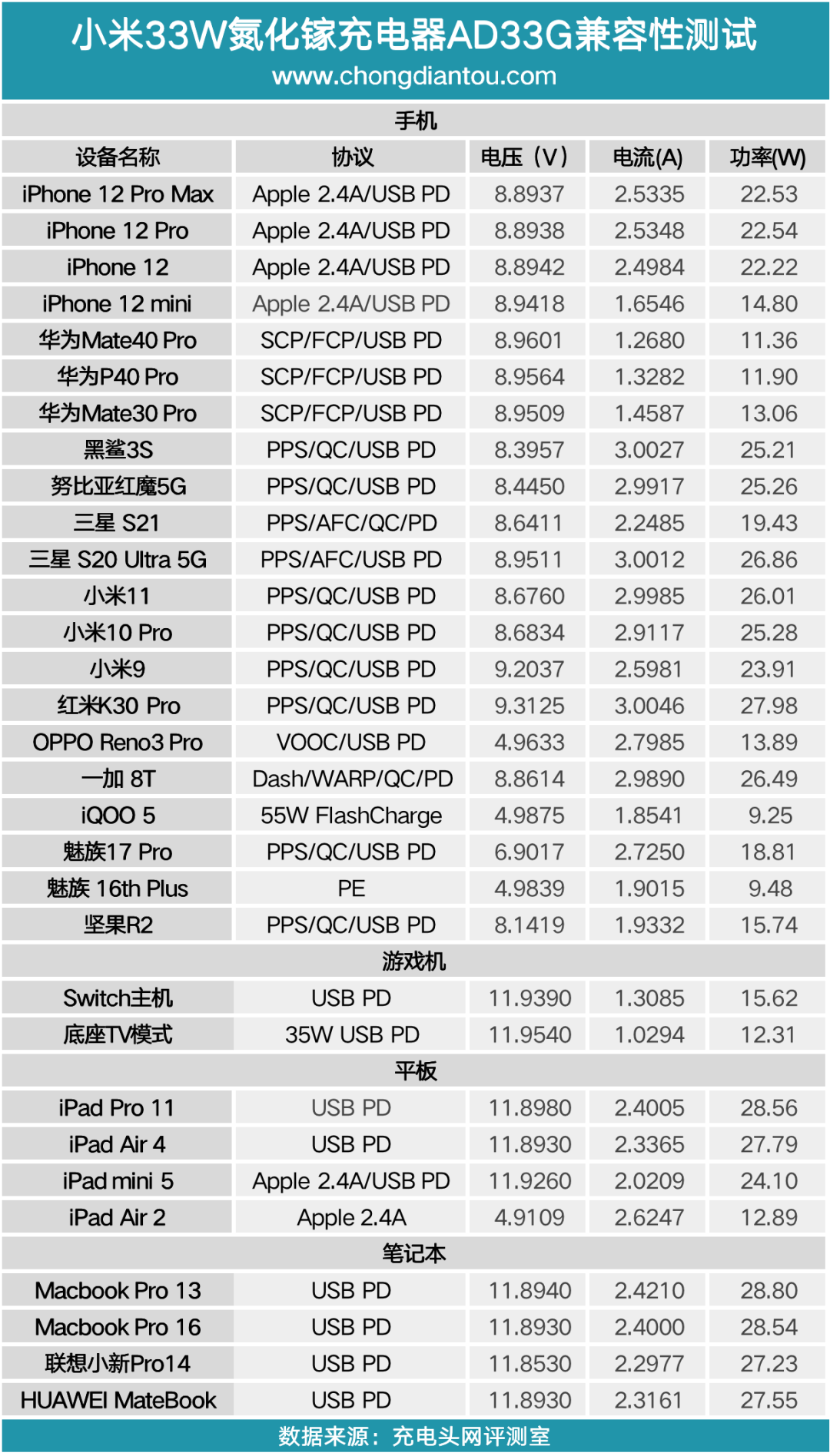 将所有的测试数据汇总,小米33W氮化镓充电器对于设备快充的支持情况表现不错,尤其是针对小米系、三星、黑鲨、一加等支持PPS快充的手机的充电功率表现非常好。