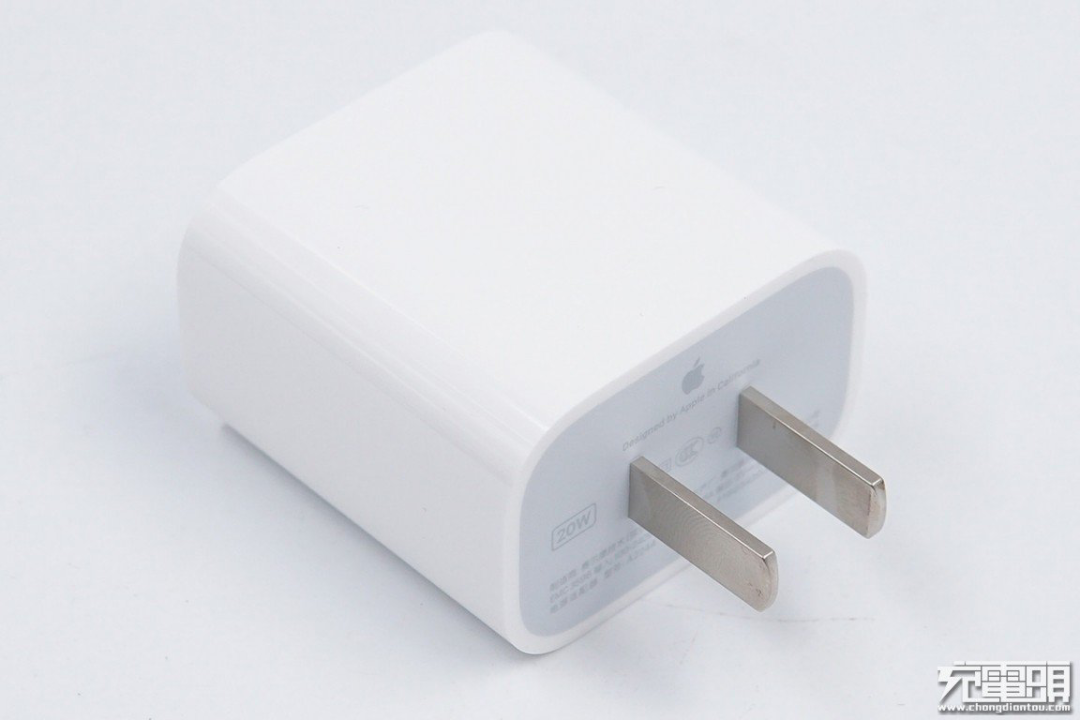 苹果20W PD充电器延续了18W PD充电器的造型风格,整体机身较为方正,边角处过渡圆润,上下则做了削平的处理,且插脚不可折叠。