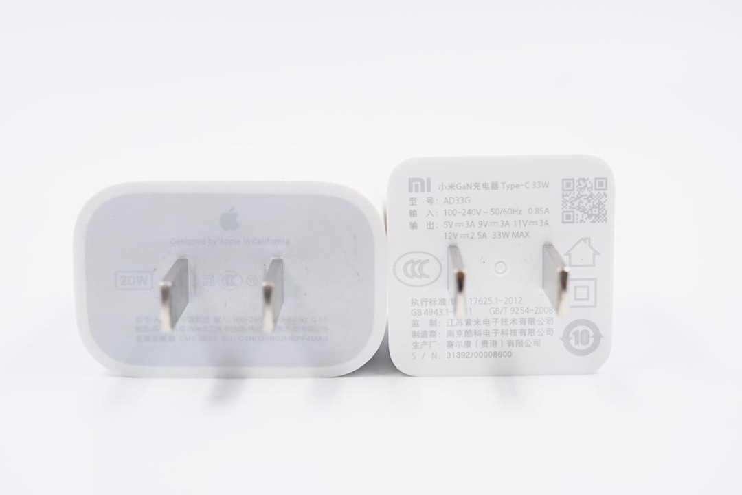 苹果20W PD充电器是2020年苹果秋季发布会上和iPad Air 4同时登场的充电器,而小米33W氮化镓充电器则是小米最新推出的小体积大功率的充电器。两款充电器在推出时间上差了几个月,小米氮化镓充电器目前的关注度也是非常高。