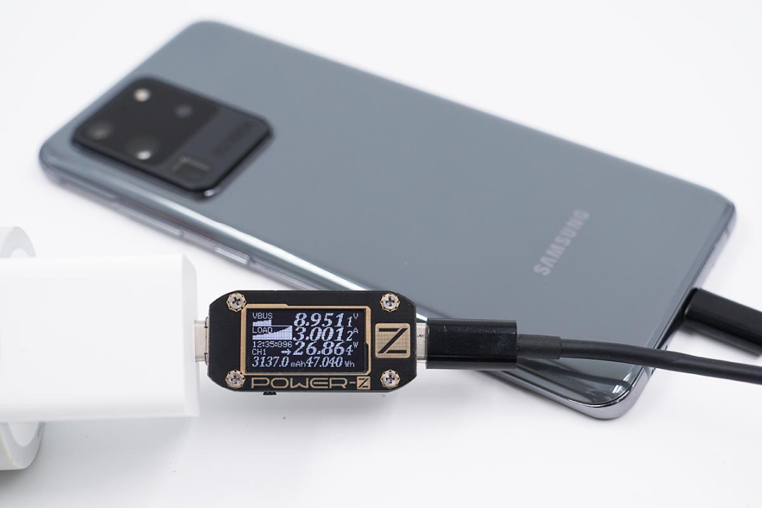 使用充电器为三星S20 Ultra充电,功率为8.95V 3.00A 26.86W。