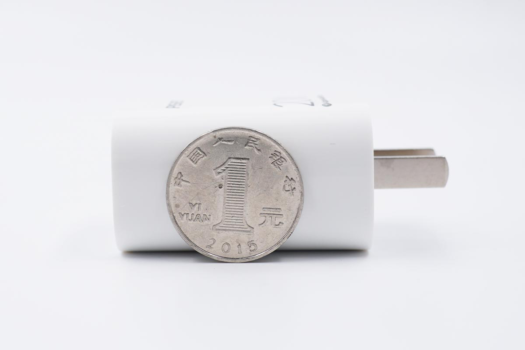 整个充电器的厚度大致和立着的一元硬币相当。