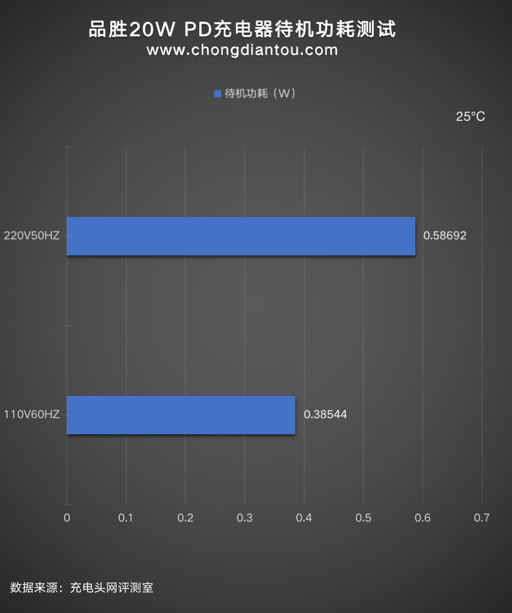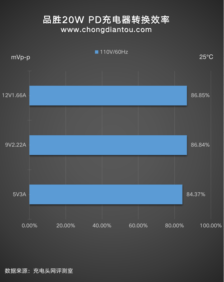 我们平时看充电器上面的参数输出100W或者65W是充电器可以为设备提供的最大输出功率,但充电器从插座上汲取的功率往往要更大一些,下面是品胜20W充电器在220V 50Hz和110V 60Hz交流输入的情况下分别进行了转换效率测试,测试结果如下: