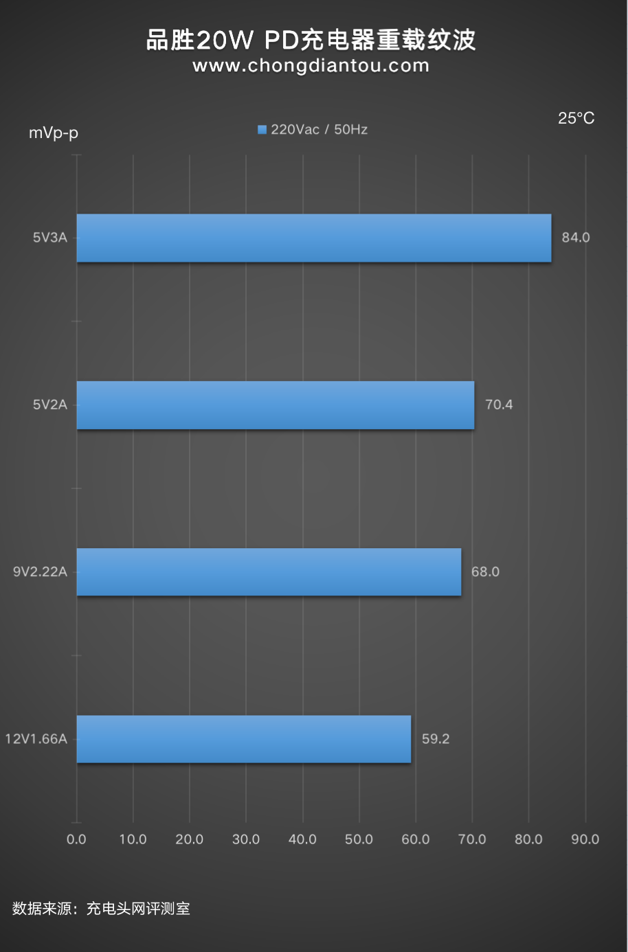 重载情况下:四个档位输出时纹波峰峰值从59.2mVp-p到70.4mVp-p不等。