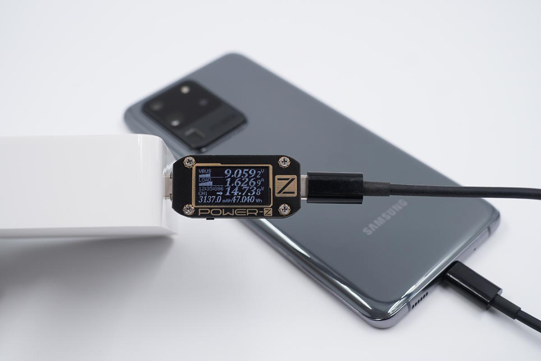 使用充电器为三星S20 Ultra充电,功率为9.05V 1.62A 14.73W,充电器可以为三星S20 Ultra提供PD快充。