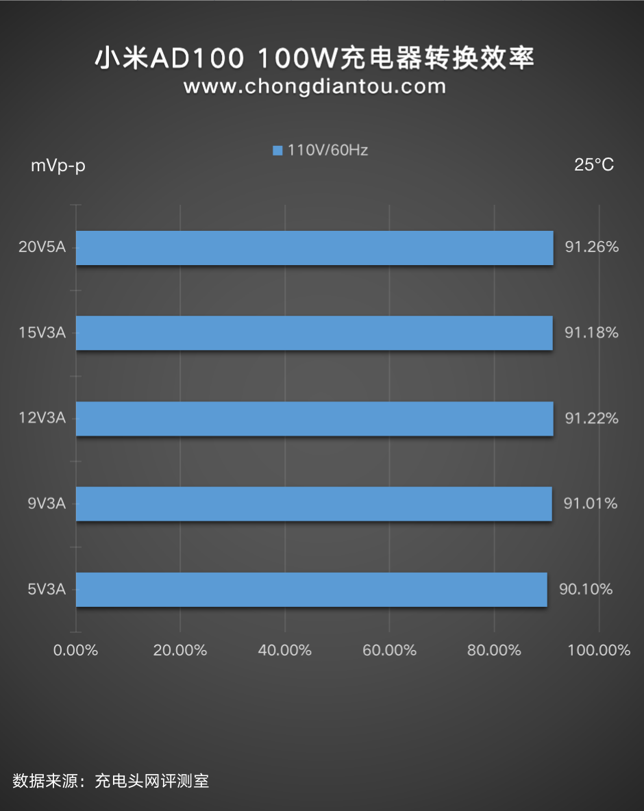 110V 60Hz下,充电器的转换效率从90.10%到91.26%不等。