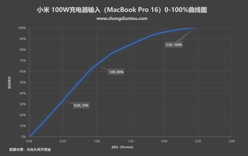 将测试过程绘制成曲线图,实测小米100W充电器半小时为MacBook Pro 16充入33%的电量,1小时充电66%,完全充满需要2小时26分。