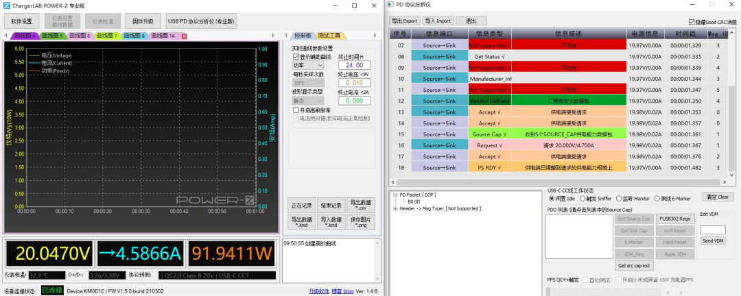 这也是POWER-Z KM001C测试仪的一大特点,可以监测到当设备连接到充电器之后开始充电到握手适合的快充输出档位之间的一系列变化过程。