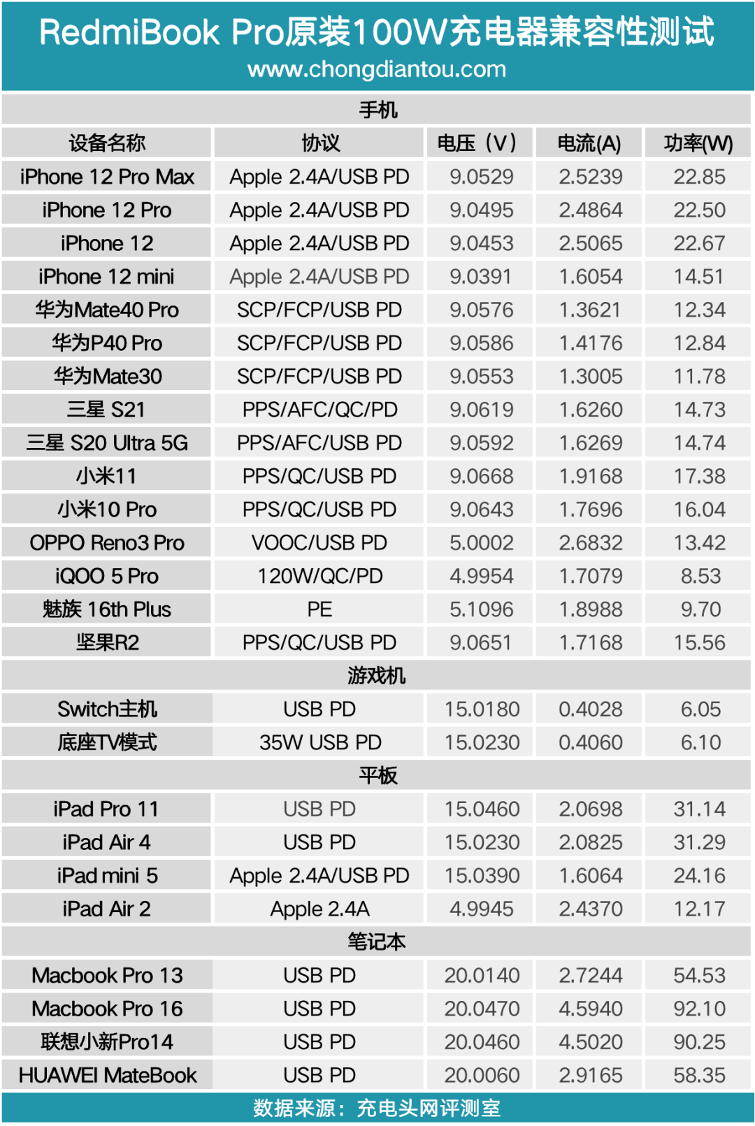 将测试数据汇总成表,因为充电器采用单USB-C输出接口设计,所以在为设备充电时会优先握手PD快充,以上测试在为大部分设备充电时均可以握手PD快充,总体表现不错。