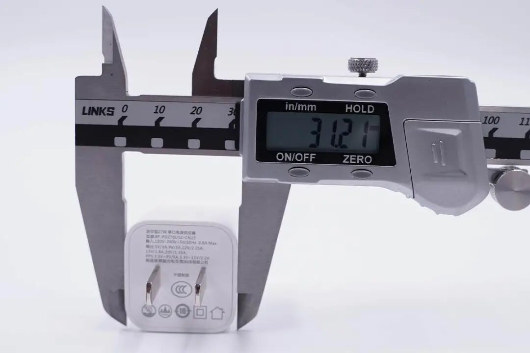 使用卡尺实测充电器不算插脚的长度约为30.85mm。