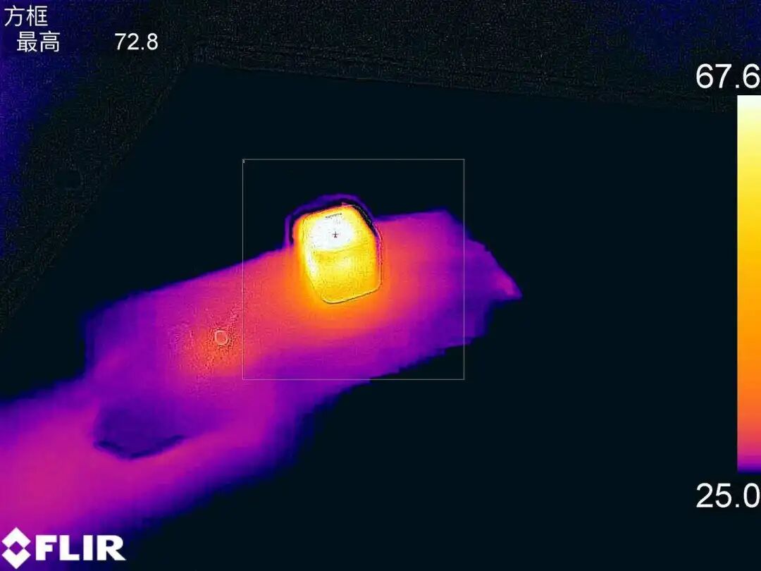 在如此小体积的情况下可以实现5-20V的全电压档位,并且支持最高27W的输出功率,那充电器的温控表现如何呢,下面一起来测试一下。测试条件为在温度约为25℃的恒温箱中以20V 1.35A 27W的功率持续输出一小时的温升情况进行测试。