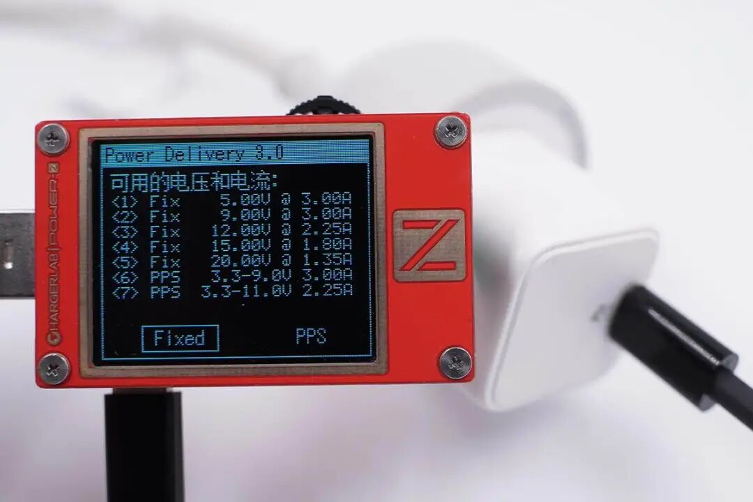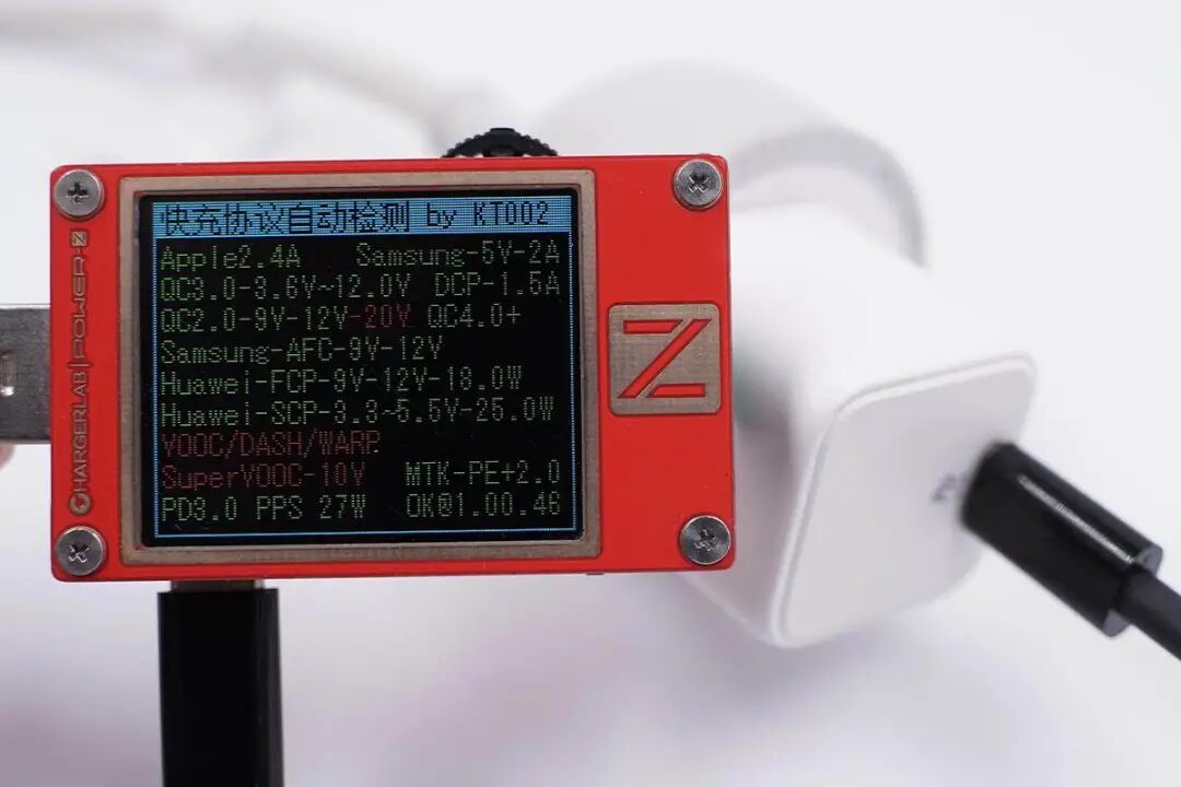 使用POWER-Z KT002读取充电器的快充协议,实测充电器支持PD、PPS、Apple2.4A、QC2.0、QC3.0、AFC、FCP、SCP、MTK-PE快充协议。