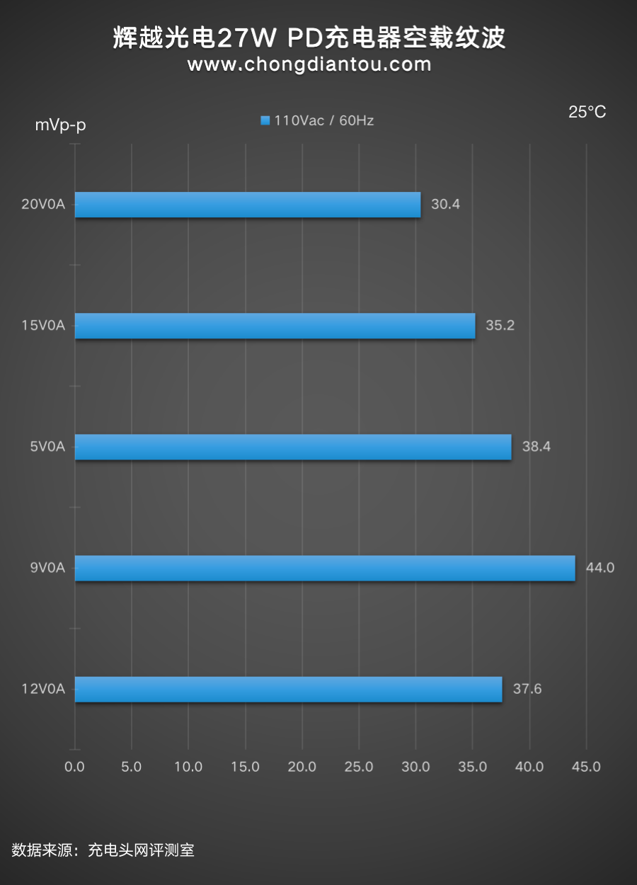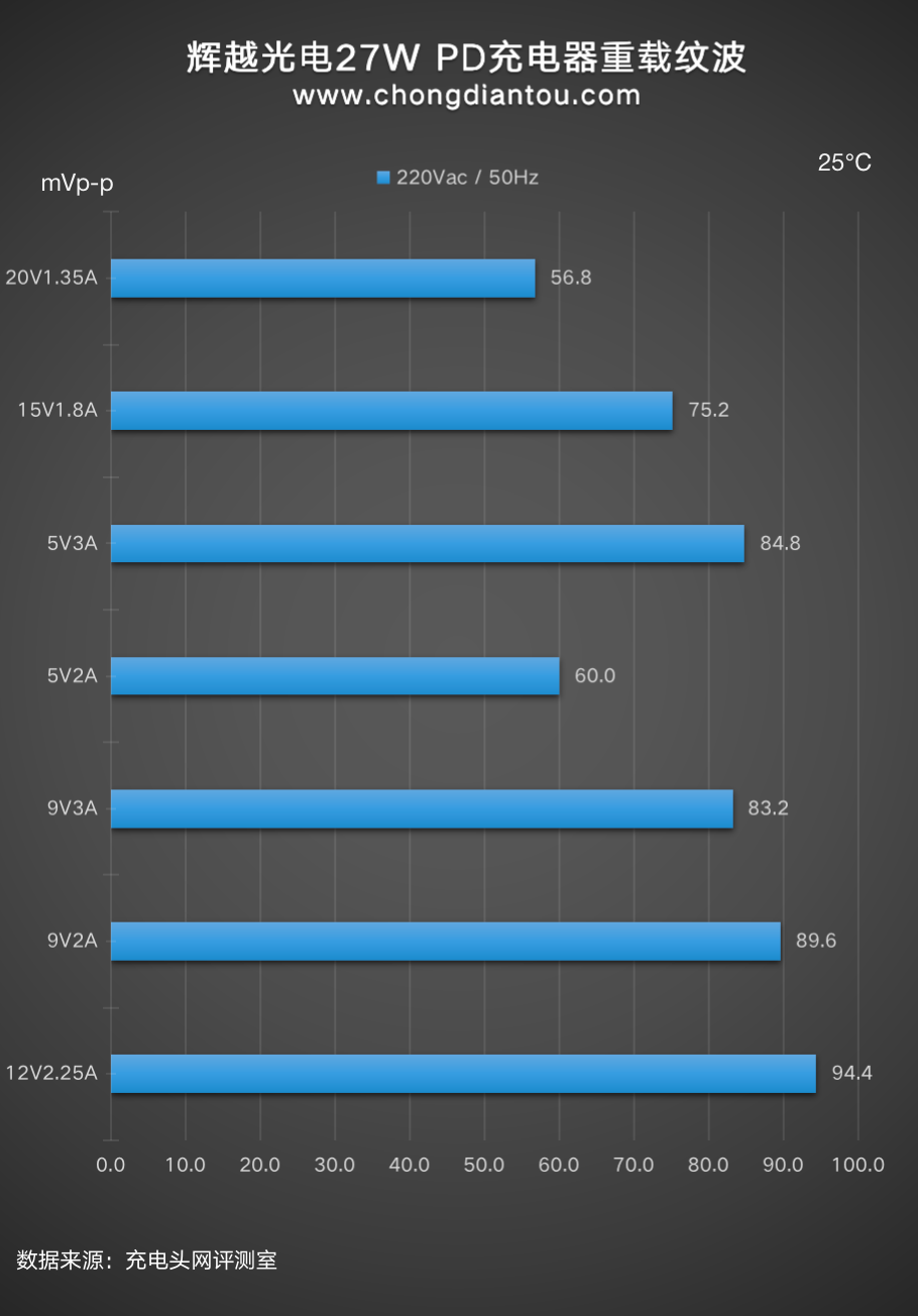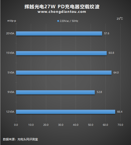 辉越光电27W PD充电器在220V 50Hz交流输入的情况下进行了空载与重载的纹波测试,测试结果如下: