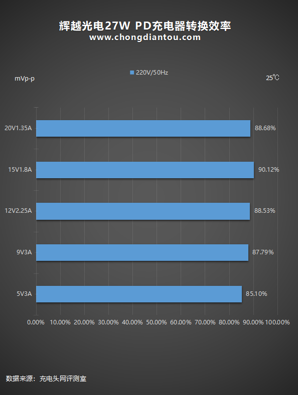 220V 50Hz下,将辉越光电27W PD充电器在各个电压档位的输出功率拉满进行测试:五个档位测得插线板AC端输入功率和USB端输出功率,通过计算,可得充电器的转换效率从85.10%到90.12%不等。
