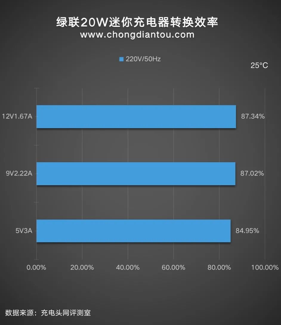 我们平时看充电器上面的参数输出100W或者65W是充电器可以为设备提供的最大输出功率,但充电器从插座上汲取的功率往往要更大一些,下面是绿联20W迷你小金刚充电器在220V 50Hz和110V 60Hz交流输入的情况下分别进行了转换效率测试,测试结果如下: