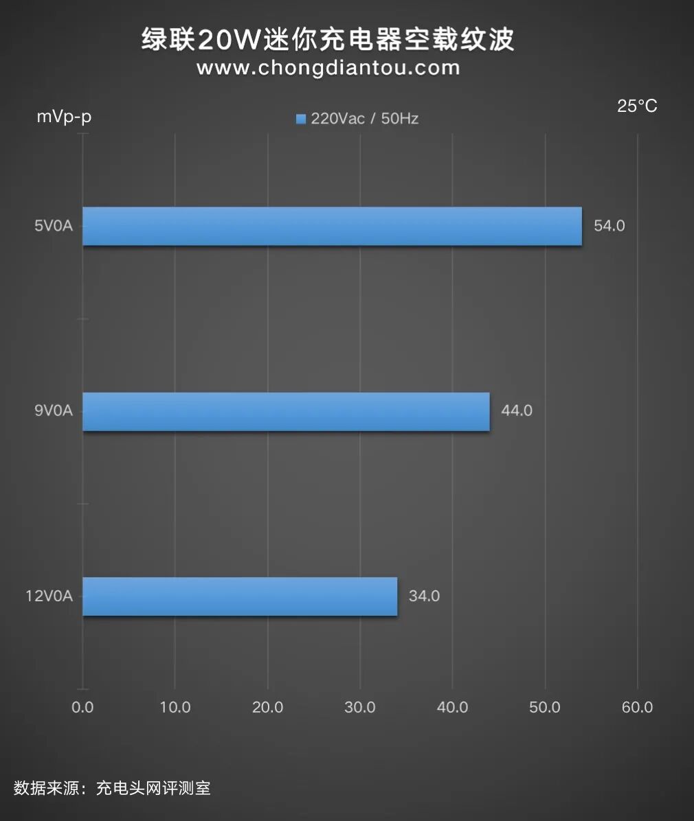绿联20W迷你小金刚充电器在220V 50Hz交流输入的情况下进行了空载与重载的纹波测试,测试结果如下: